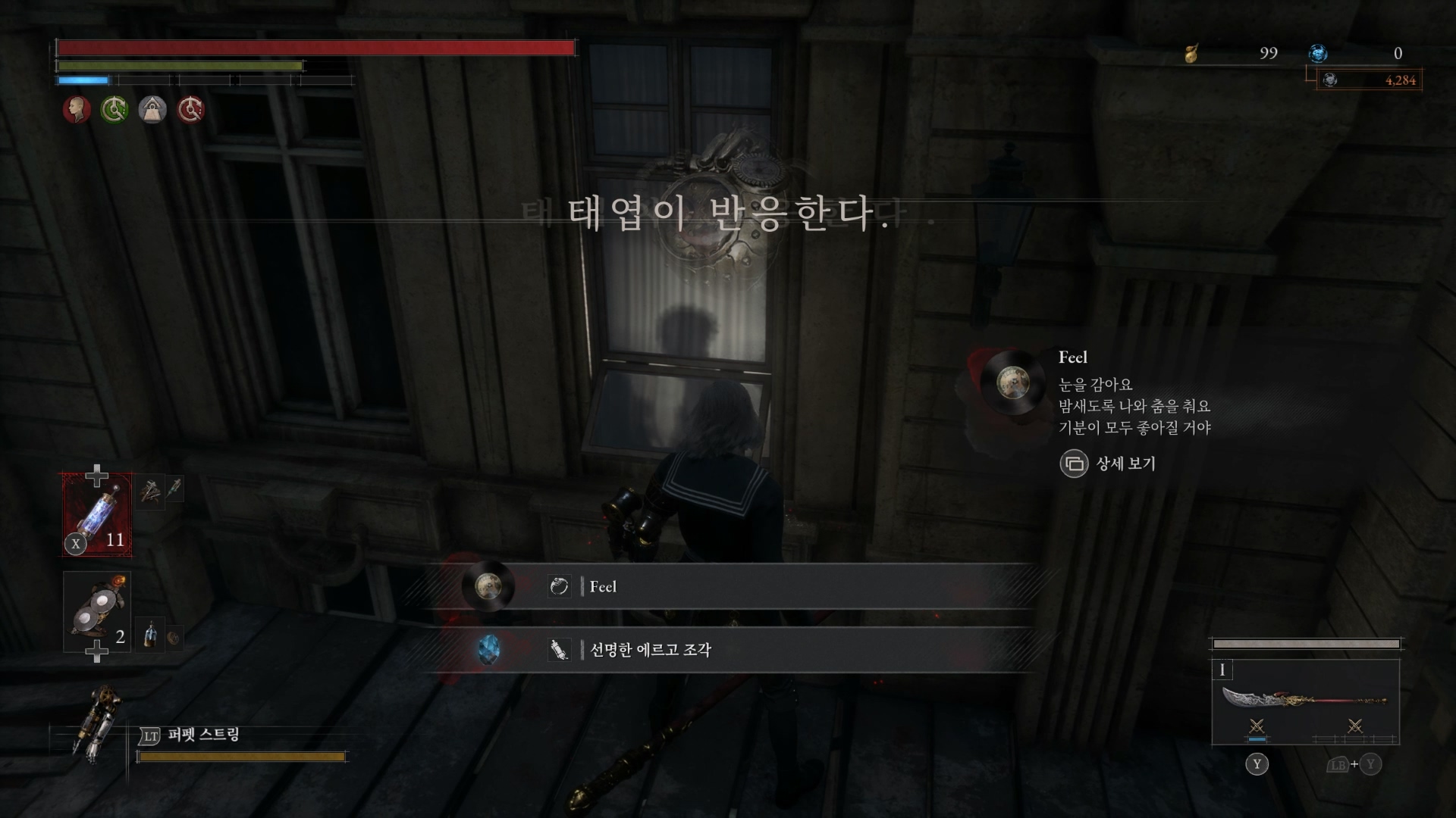 거짓말을 했으니 P의 태엽이 반응하고, 퀘스트 보상으로 음반(Feel)과 선명한 에르고 조각을 얻었다.